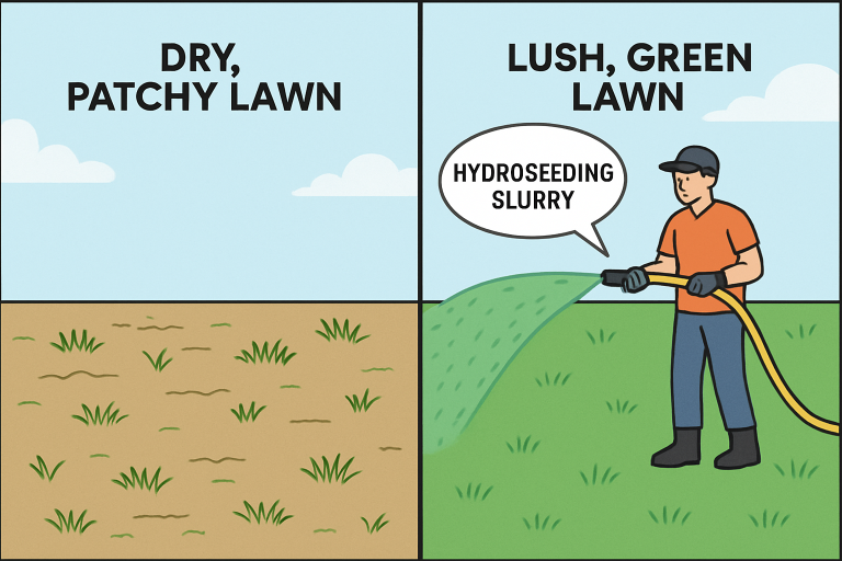 - Superior Coverage: Hydroseeding’s mixed slurry adheres well to slopes, uneven terrain, and large properties—minimizing bare spots and patchy results.